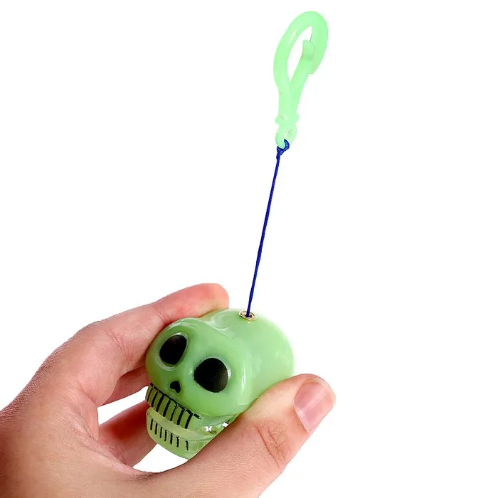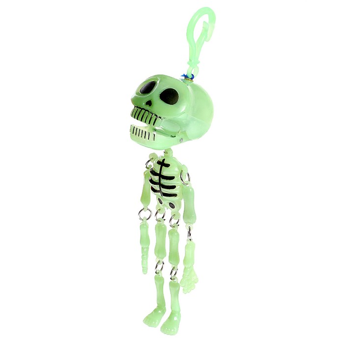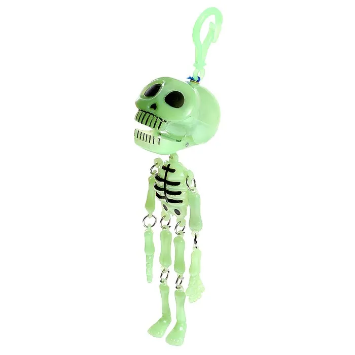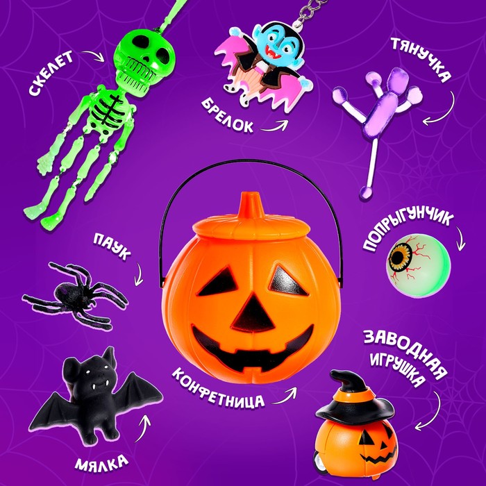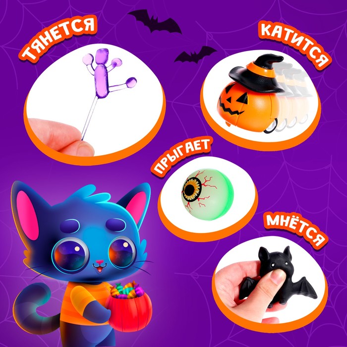 - В наборе семь игрушек-сюрпризов: заводная игрушка, брелок, попрыгунчик, тянучка, скелет (брелок с заводным механизмом), мялка, игрушечный паук.