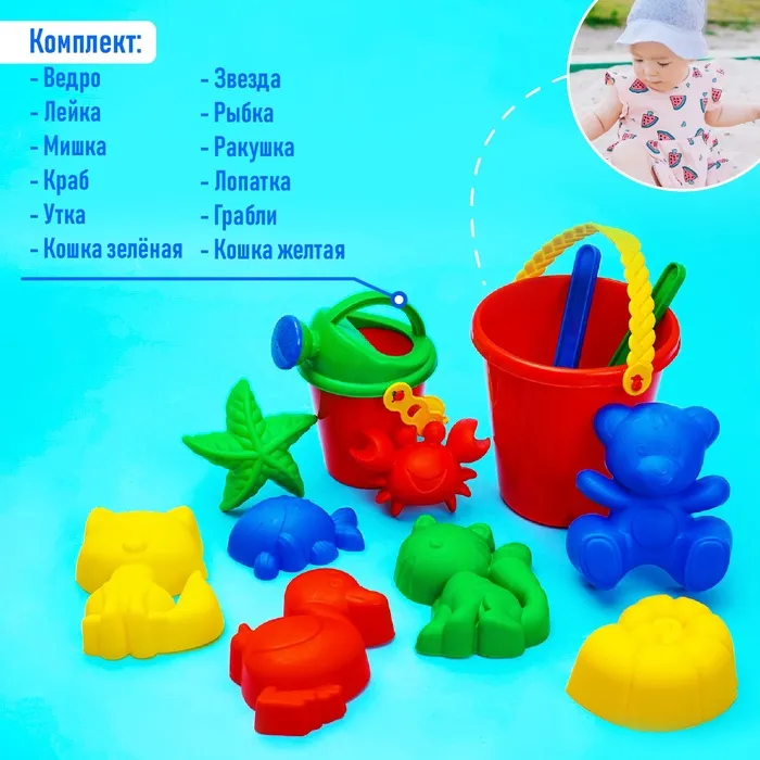 Песочница — любимое место игр для малышей. Сделать их ещё интереснее поможет яркий и удобный набор игрушек. Всё, что нужно для строительства замков, лепки фигурок и веселых экспериментов с песком и водой.