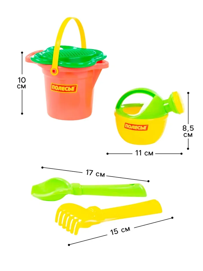 - В набор входят все необходимые инструменты для игр в песочнице. Ребёнок сможет копать, просеивать, строить и украшать свои песочные шедевры.