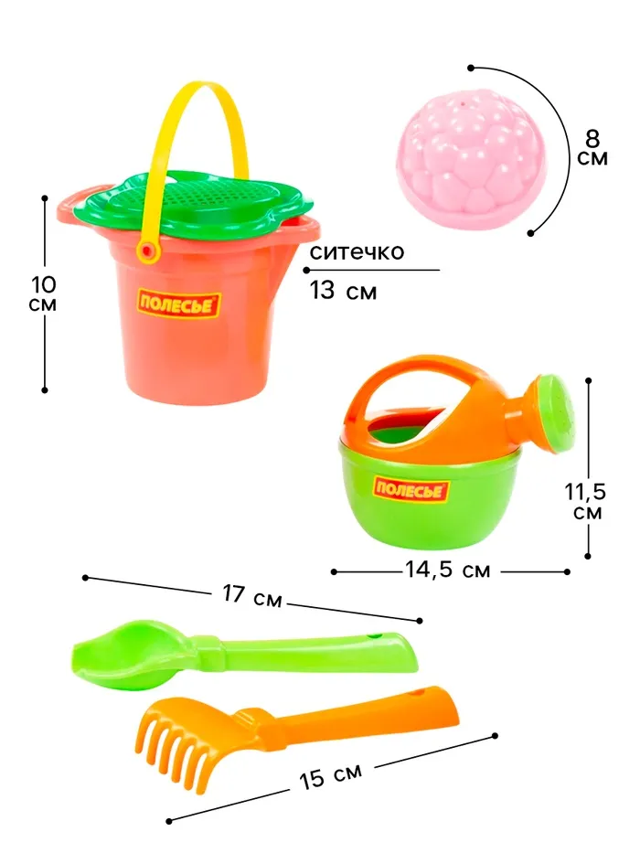 Набор игрушек для песочницы, 7 предметов: ведро, ситечко, совок, грабельки, формочки, лейка, МИКС — Характеристики