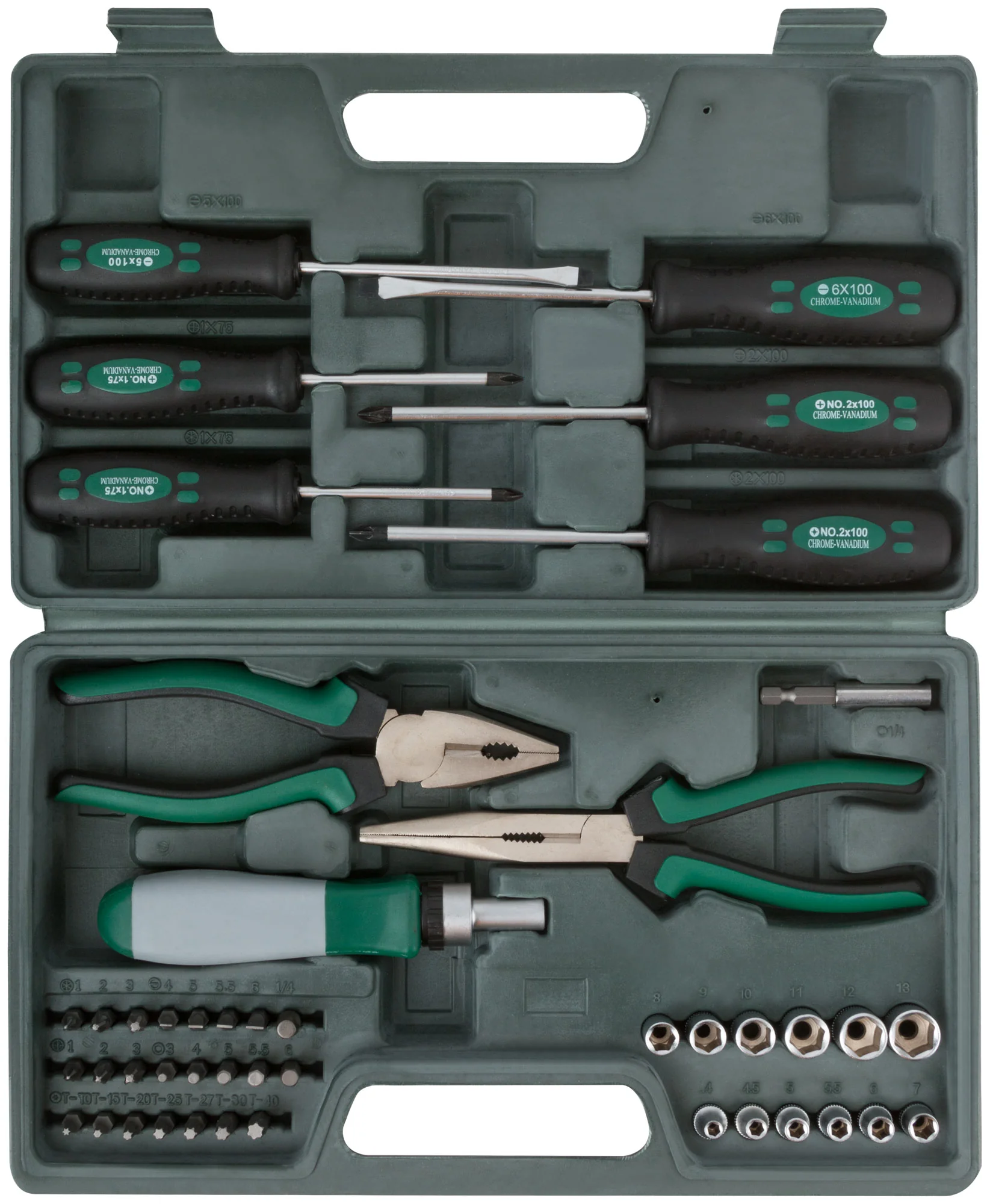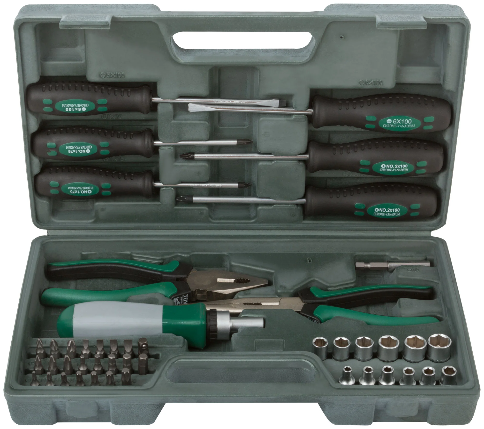Набор инструмента 45 шт. с пассатижами, отвертками и битами в пластиковом чемодане