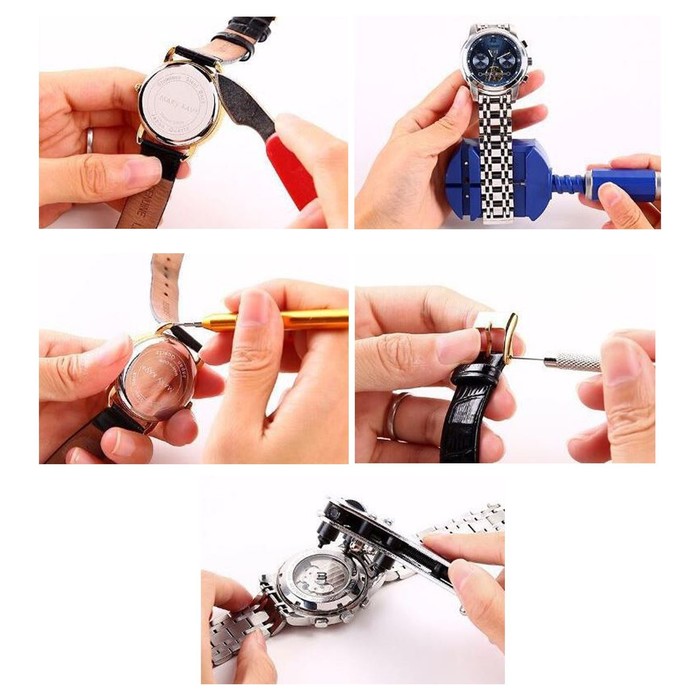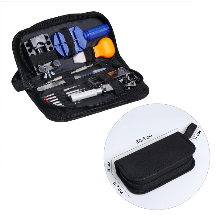 Набор инструментов часовщика прекрасно подойдет как в профессиональных условиях, так и в домашних условиях ремонта часов. Набор включает все необходимые предметы для вскрытия корпуса, регулировки длины браслета, замены батареек. Чехол на молнии удобно брать с собой, а также он предотвратит потерю любого инструмента.