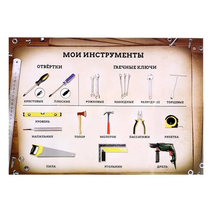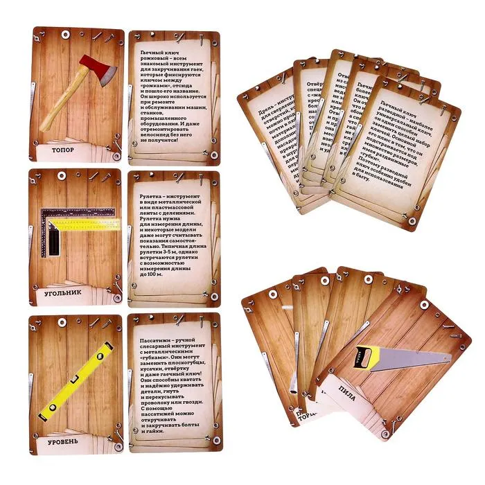 - Обучающие карточки помогут ребенку запомнить названия инструментов и их применение.
