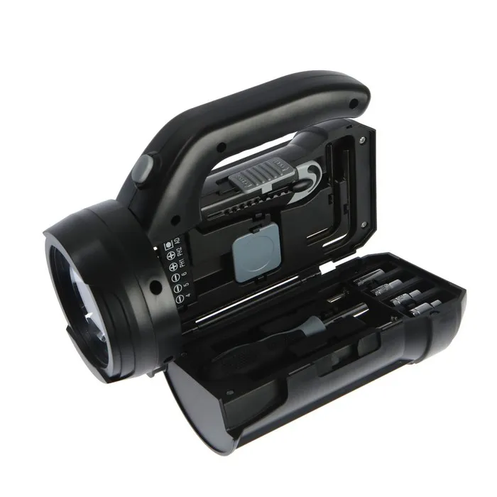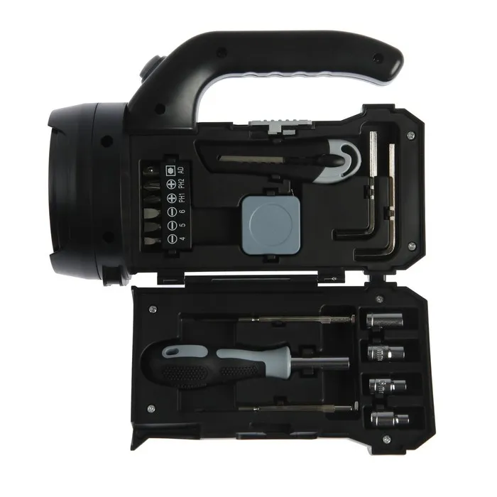 Встроенный фонарик позволяет осуществлять действия в темноте. Питание фонарика происходит от батареек (в комплекте не предоставляются). Набор обладает компактными размерами, что позволяет его хранить как дома, так и в автомобиле.