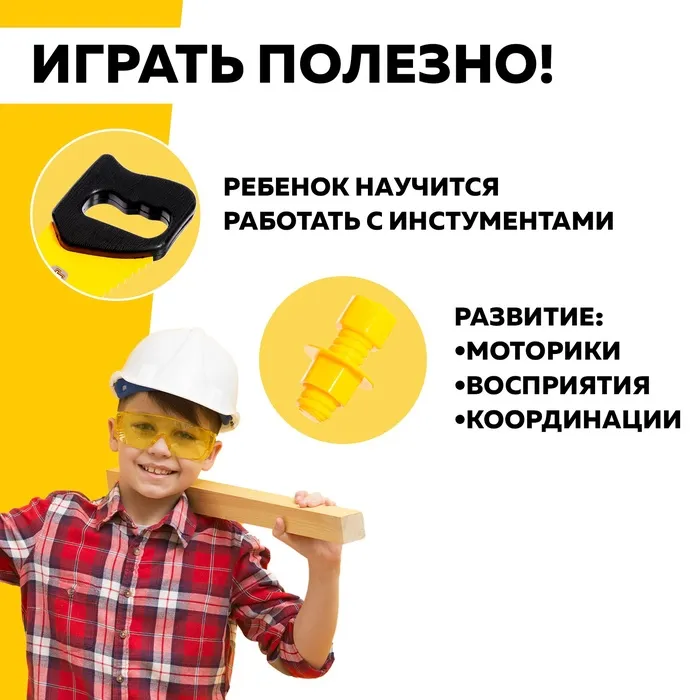 - Яркий и прочный: все инструменты сделаны из крепкого пластика, который не сломается, даже если ты решишь построить целый город. Их яркие цвета делают игру ещё веселее — теперь каждый инструмент легко найти!