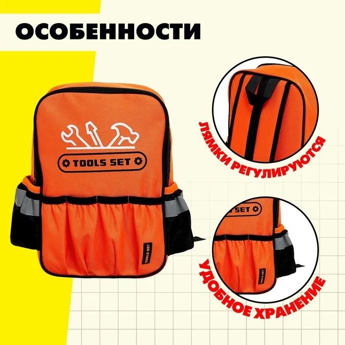 Каждый ребёнок мечтает о собственном наборе инструментов, чтобы строить, чинить и помогать взрослым. С набором «Мастер» в рюкзаке малыш почувствует себя настоящим мастером! В комплект входит 28 предметов, среди которых функциональный шуруповёрт, каска, ручные инструменты и крепёжные детали. А благодаря рюкзаку ребёнок сможет брать свои инструменты с собой и хранить их в порядке!