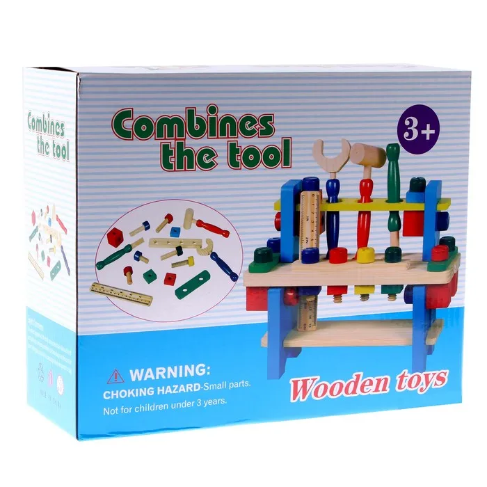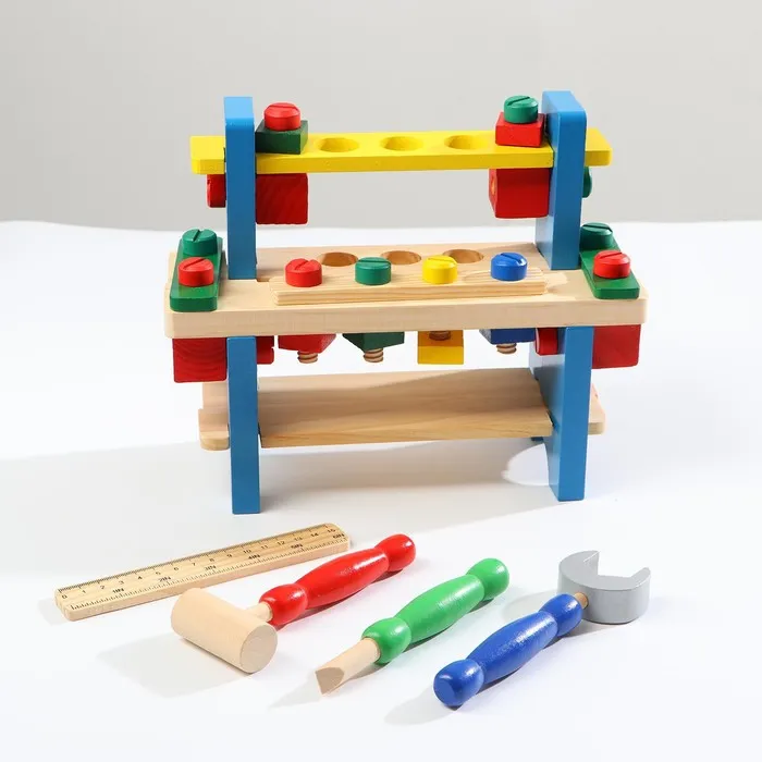 Деревянный конструктор в виде верстака плотника — это первая встреча юного мастера с миром инструментов. Малыш непременно оценит оригинальную игрушку, ведь она такая яркая и приятная на ощупь. Разнообразие деталей приятно удивит ребёнка! В состав набора входит 16 предметов, в том числе молоток, гаечный ключ, отвёртка и линейка.