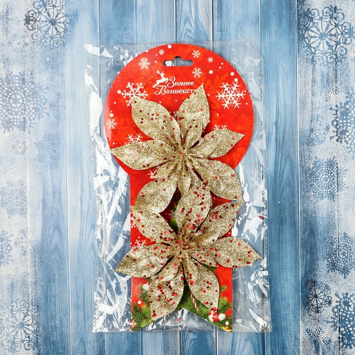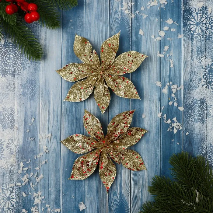 Набор из двух ёлочных украшений в форме цветка, выполненных в золотистом оттенке, станет изящным дополнением к традиционному праздничному декору. Эти классические игрушки с резным узором отражают стилистику новогоднего барокко и ар-деко, создавая атмосферу торжественности и изысканности. Высота каждой игрушки 12 см — оптимальный размер для гармоничного размещения на ветвях ёлки, придавая ей дополнительный объём и блеск.