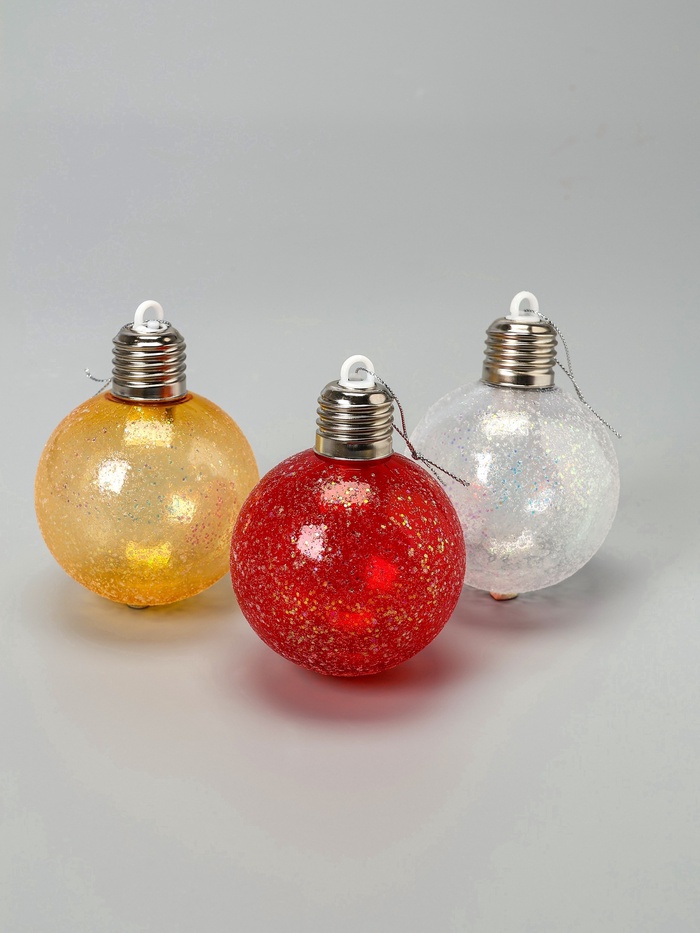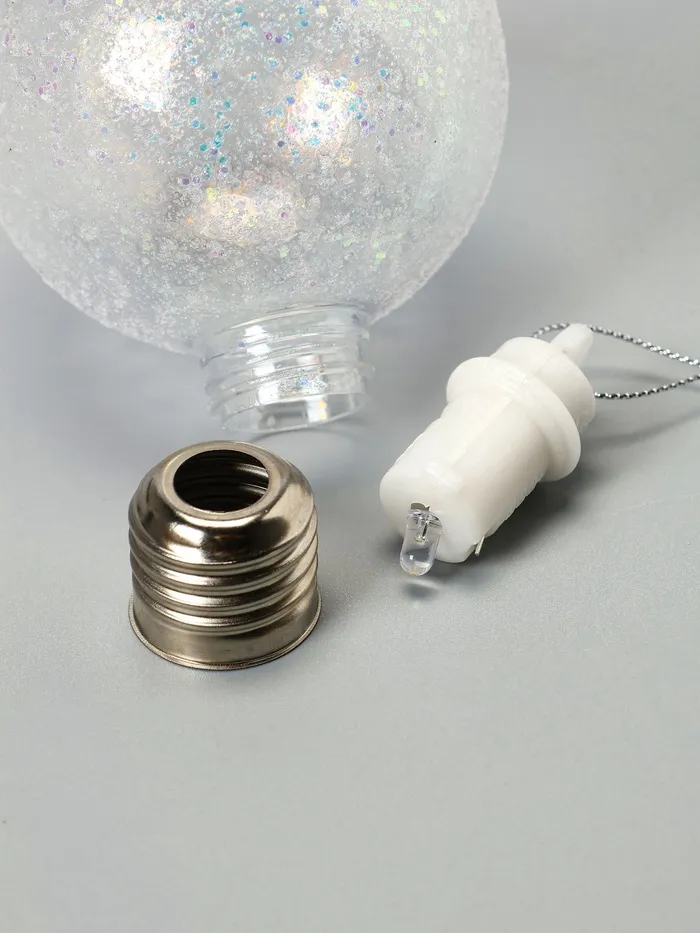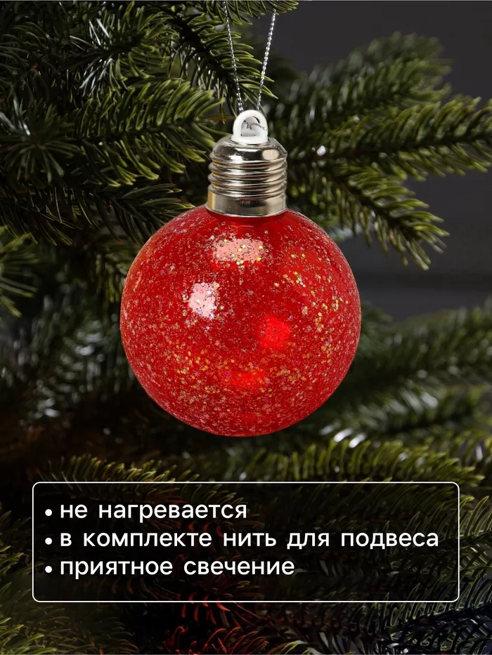 Встроенный светодиод с тёплым белым свечением создаёт мягкую, уютную атмосферу, подчёркивая красоту новогоднего декора. Питание от трёх батареек LR44 позволяет использовать шары без проводов, обеспечивая свободу в оформлении и безопасность при эксплуатации.