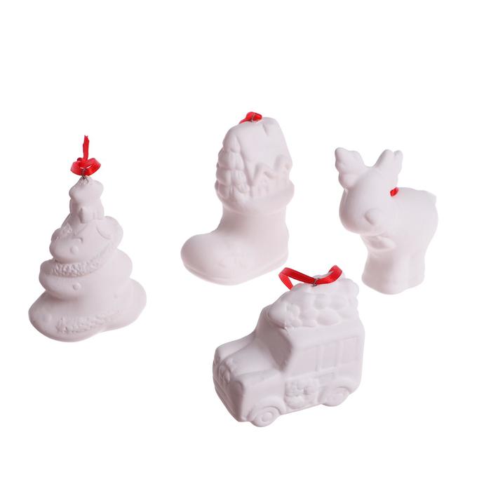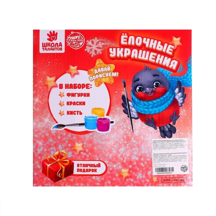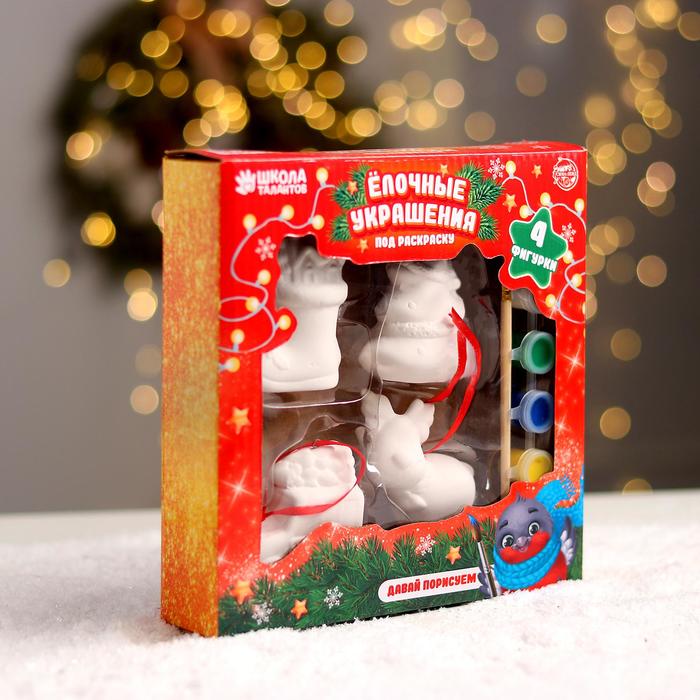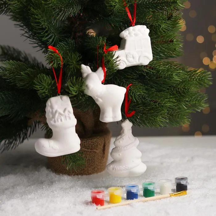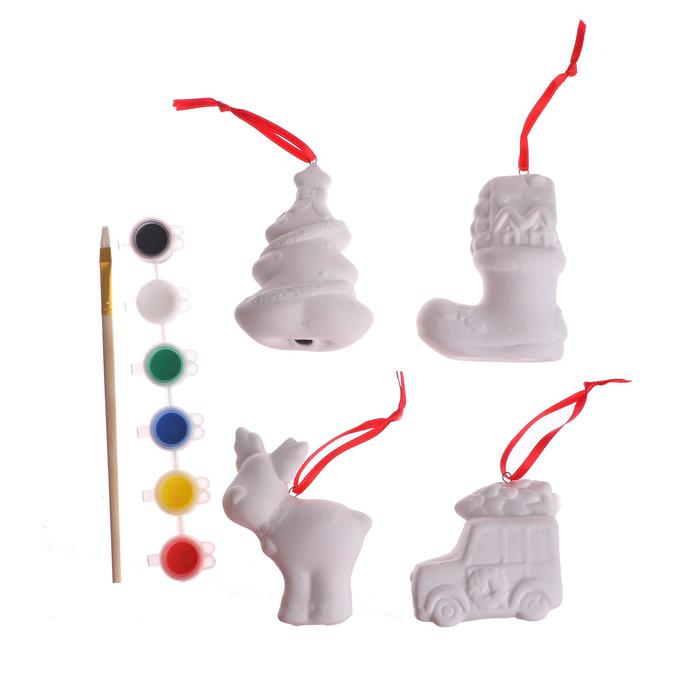 В набор входит:4 гипсовые подвески-основы, 6 акриловых краски и кисть.