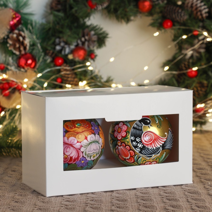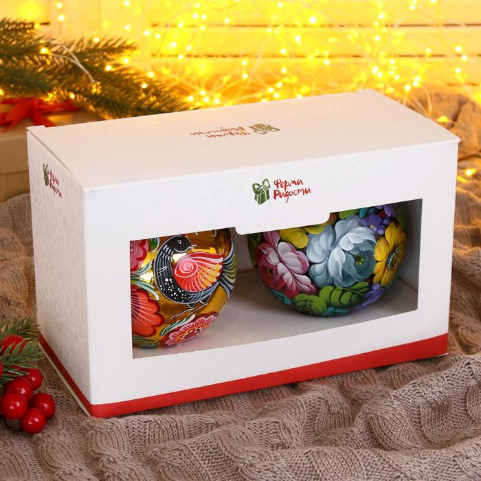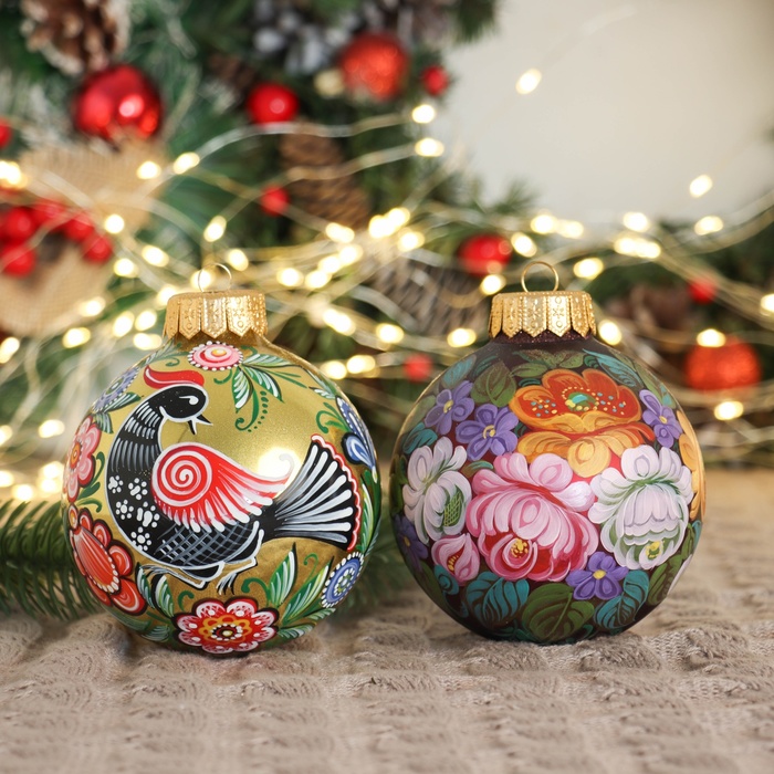 Два стеклянных шара ”Вдохновение” украсят новогоднюю ёлку нежными акцентами. Разноцветные украшения с рисунками в советском стиле с фьюжн-элементами подойдут для уютного семейного праздника.