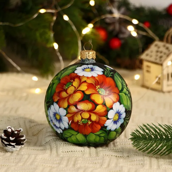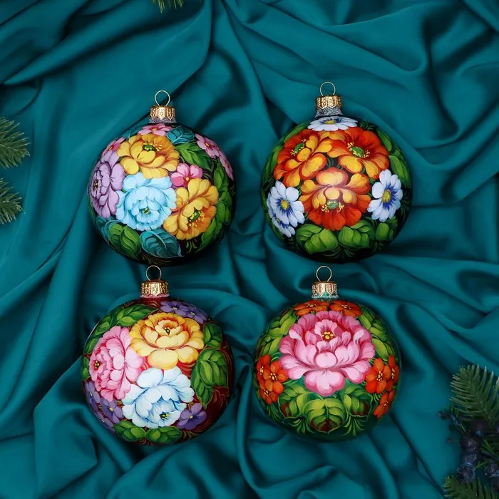Четвёрка стеклянных шаров ”Неповторимый букет” добавит яркости новогоднему дереву. Разноцветные украшения с рисунками сочетают советский стиль и фьюжн-элементы, идеально для семейного декора.