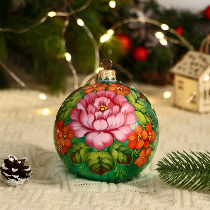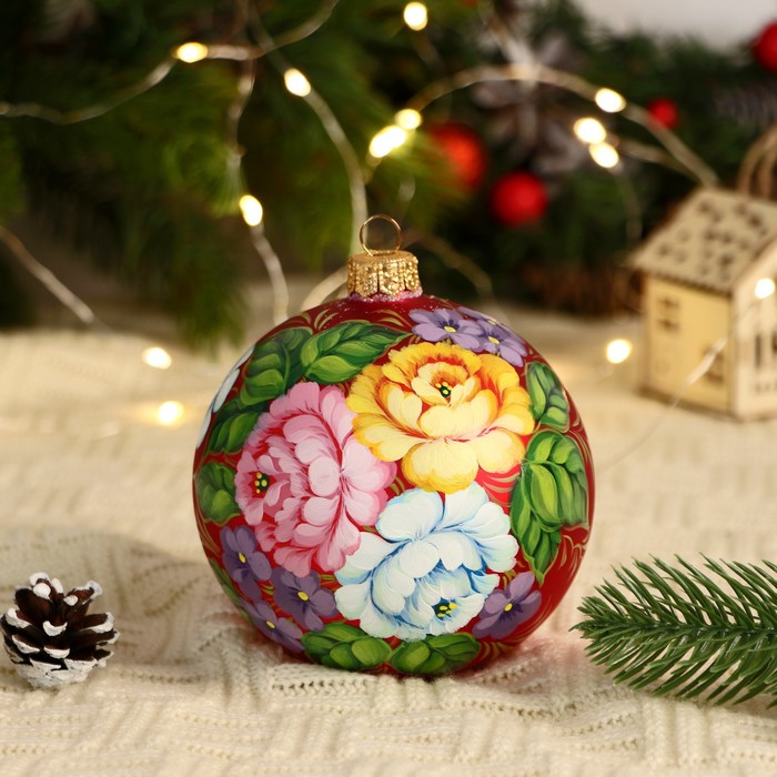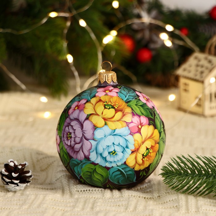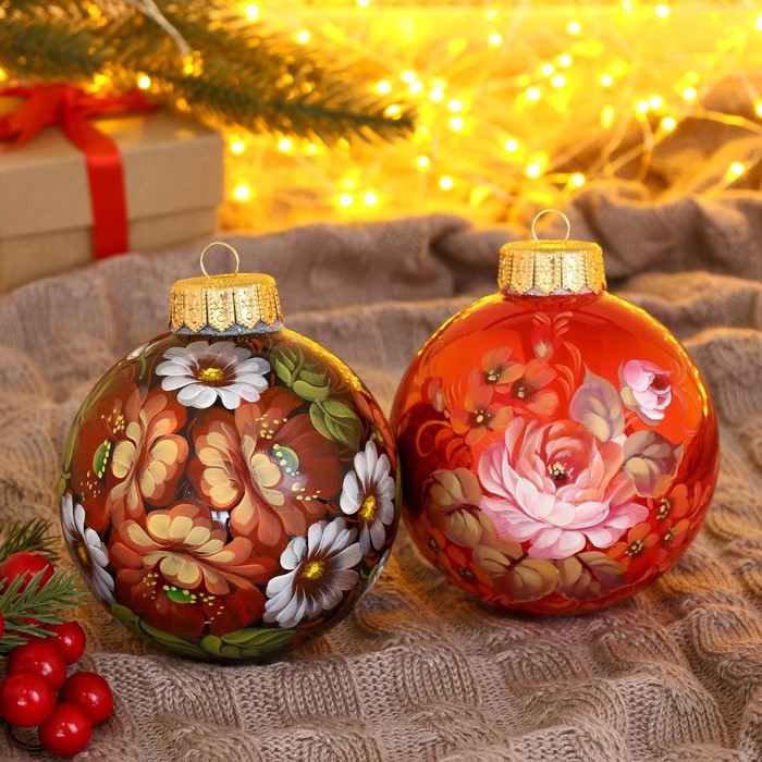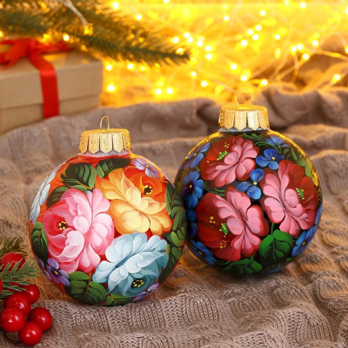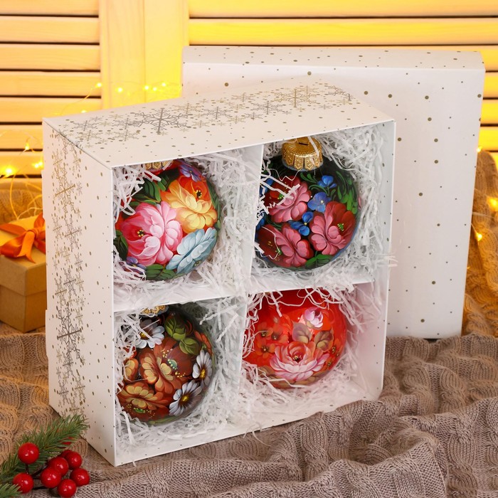 Четвёрка стеклянных шаров ”Неповторимый букет” добавит яркости новогоднему дереву. Разноцветные украшения с рисунками сочетают советский стиль и фьюжн-элементы, идеально для семейного декора.