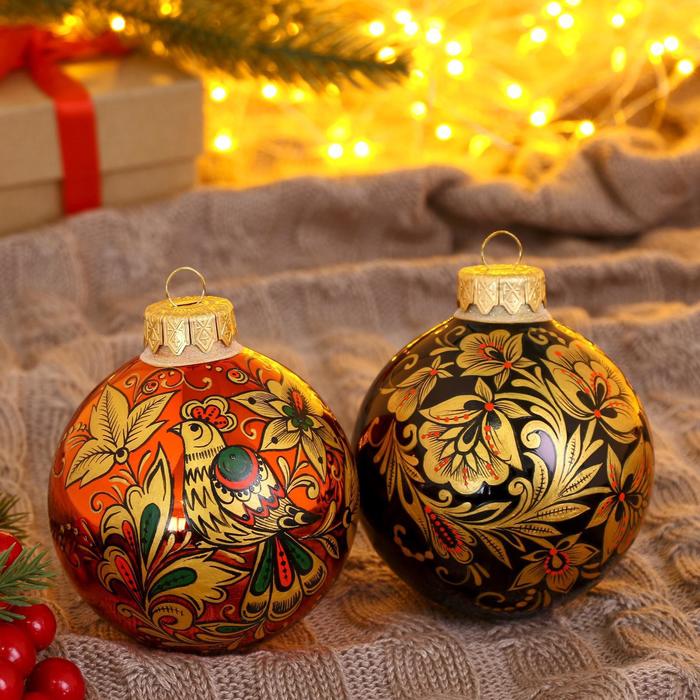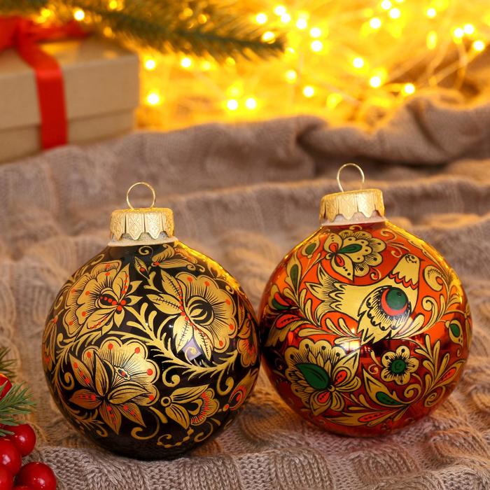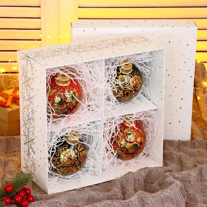 Четыре стеклянных шара ”Соцветие чудес” внесут в новогодний декор нотку волшебства. Разноцветные украшения с рисунками в советском стиле с фьюжн-элементами подойдут для праздничных композиций.