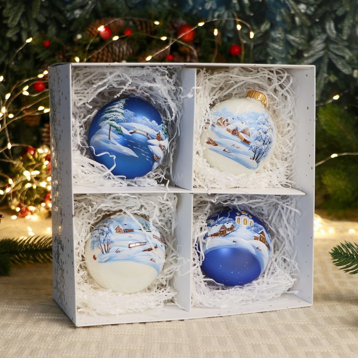 Четыре стеклянных шара ”Зимняя композиция” украсят новогоднюю ёлку изящными акцентами. Разноцветные украшения с рисунками в советском стиле с фьюжн-элементами подойдут для создания праздничной атмосферы.