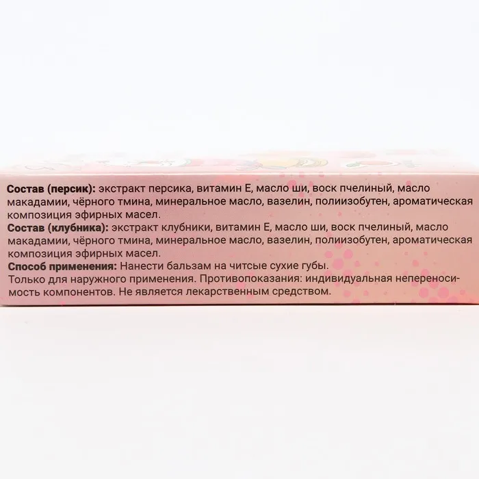 Состав: экстракты фруктов и ягод, витамин Е, масло ши, воск пчелиный, масло макадамии, масло черного тмина, минеральное масло, вазелин, полиизобутен, ароматическая композиция эфирных масел.