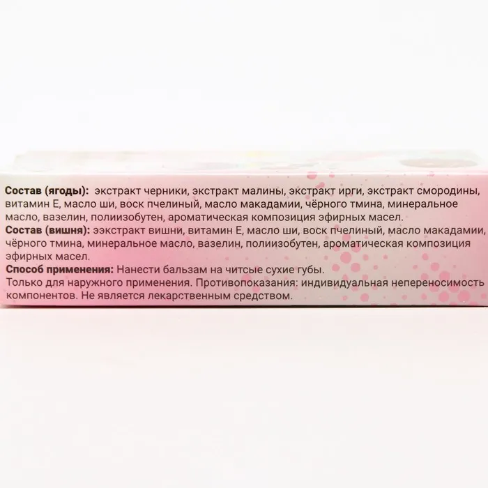 Состав: экстракты фруктов и ягод, витамин Е, масло ши, воск пчелиный, масло макадамии, масло черного тмина, минеральное масло, вазелин, полиизобутен, ароматическая композиция эфирных масел.