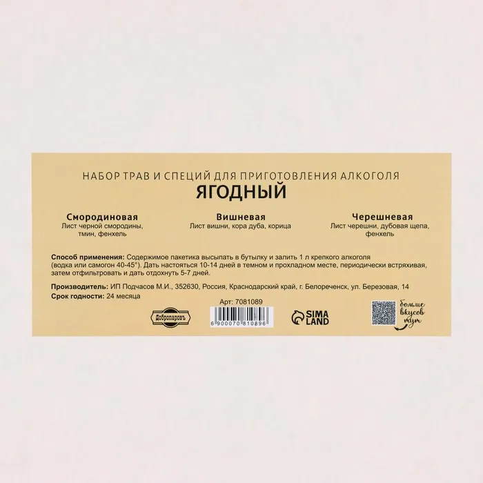 Набор из трав и специй для приготовления настойки "Ягодная" смородина,вишня,черешня, 0,7 л — Характеристики