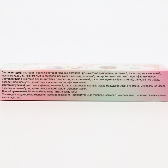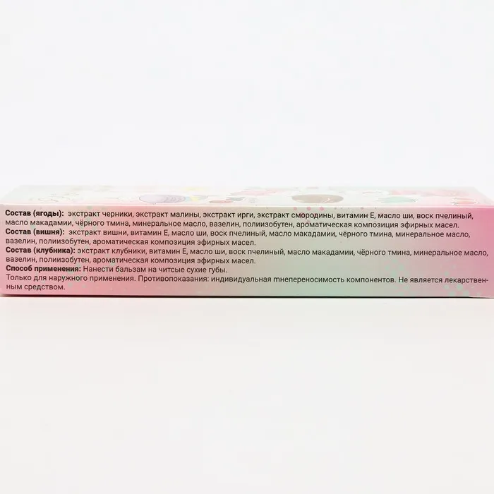 Состав: экстракты фруктов и ягод, витамин Е, масло ши, воск пчелиный, масло макадамии, масло черного тмина, минеральное масло, вазелин, полиизобутен, ароматическая композиция эфирных масел.