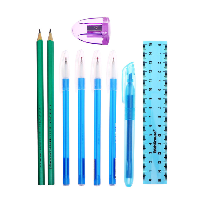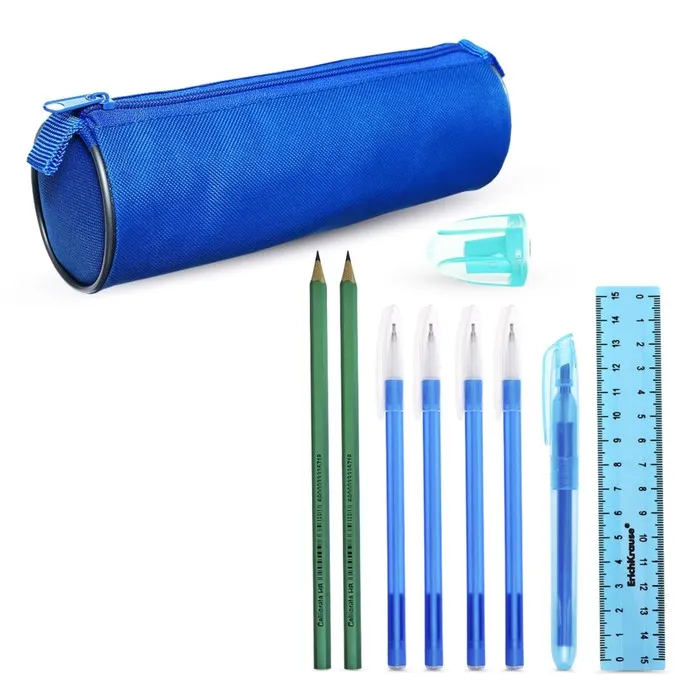 Набор канцелярский 10 предметов (Пенал-тубус 65 х 210 мм, ручки 4 штуки цвет синий , линейка 15 см, точилка, карандаш 2 штуки, текстовыделитель), синий — Характеристики