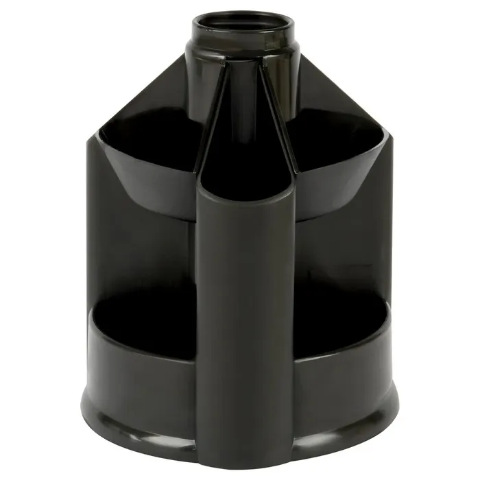 Набор канцелярских принадлежностей предназначен для удобного хранения канцтоваров на рабочем месте. Компактный органайзер выполнен из качественного полистирола, и свободно вращается на 360 градусов. Размер подставки - 14 х 10,7 х 10,7 см. Изделие представлено в чёрном цвете, и имеет 10 отделений под различные канцелярские предметы.