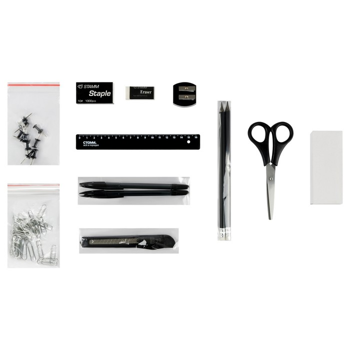 Органайзер и наполнение упакованы в картонную коробку.В состав набора входят: 2 шариковые ручки, 2 чернографитных карандаша, степлер для скоб №10, скобы №10, ножницы, канцелярский нож, точилка, ластик, линейка, скрепки 30 шт. и кнопки 10 шт.Размер: 14 х 10,7 х 10,7 смМатериал органайзера: полистиролКоличество предметов: 13 шт.Тип упаковки: картонная коробка