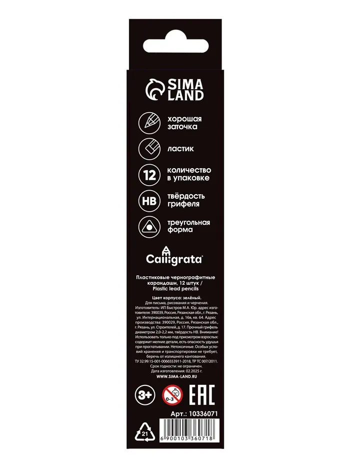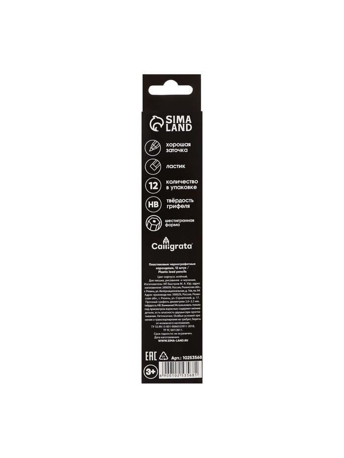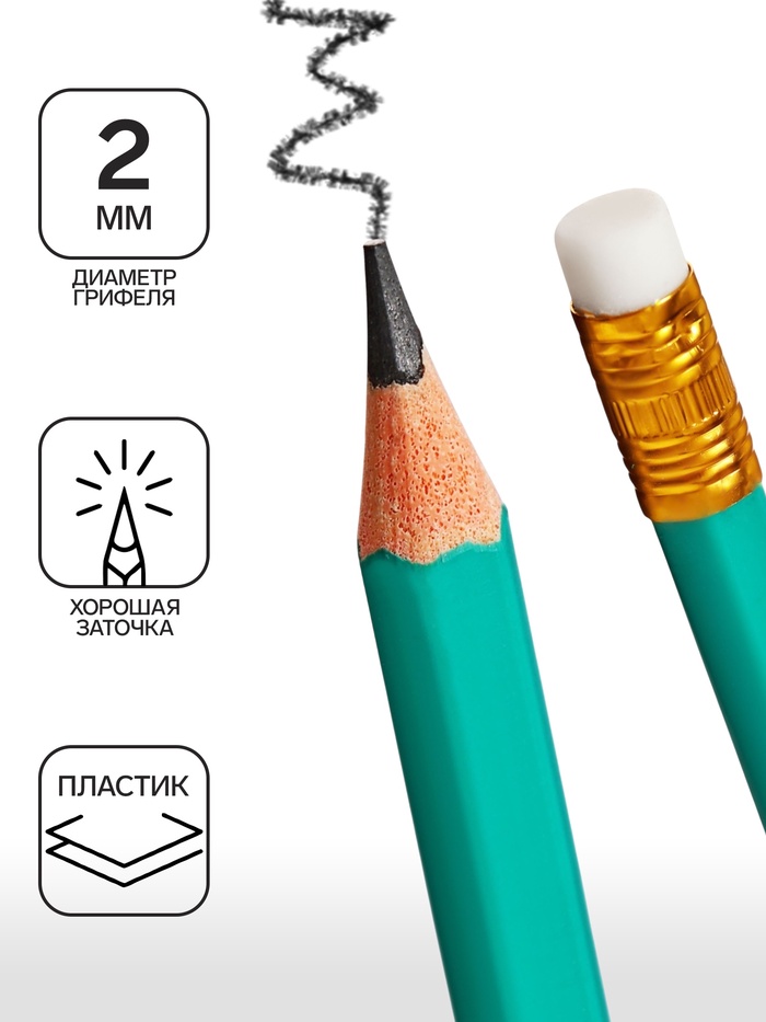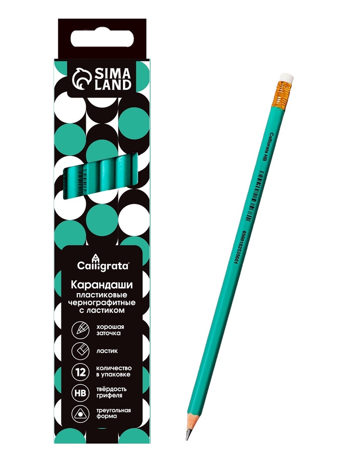 Набор карандашей чернографитных 12 штук, Calligrata Classic, с ластиком, заточенные, пластик, трехгранные, зеленые — Характеристики