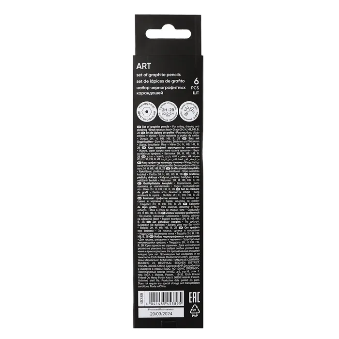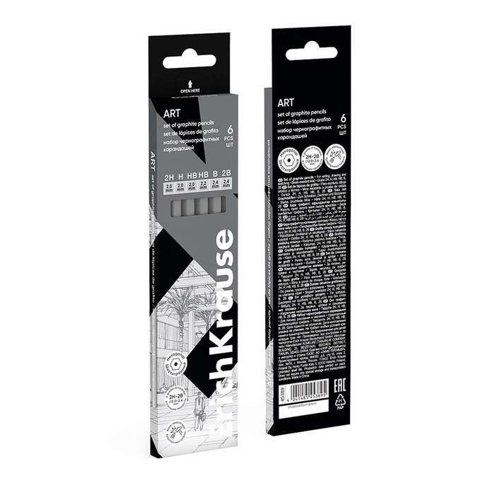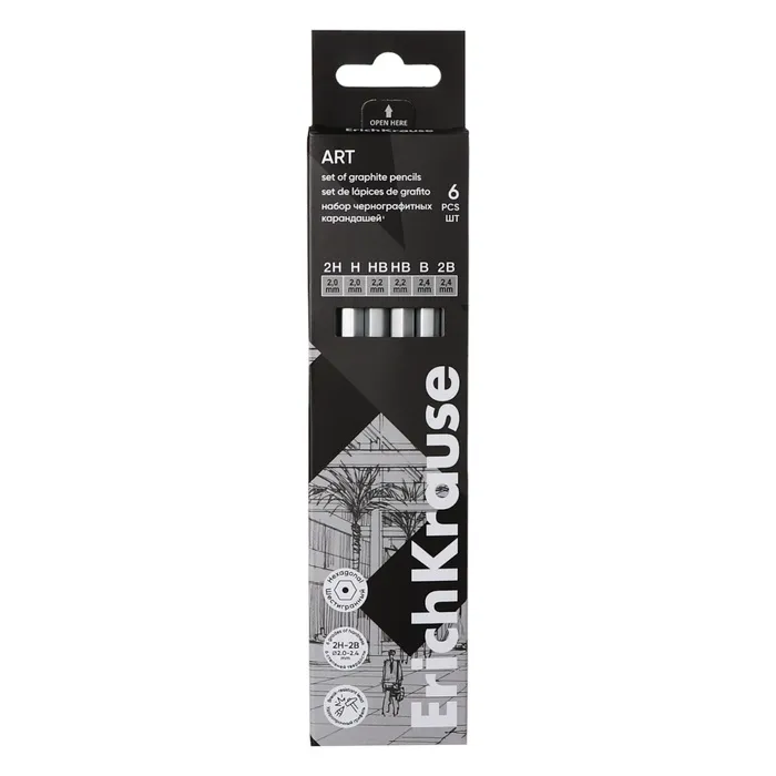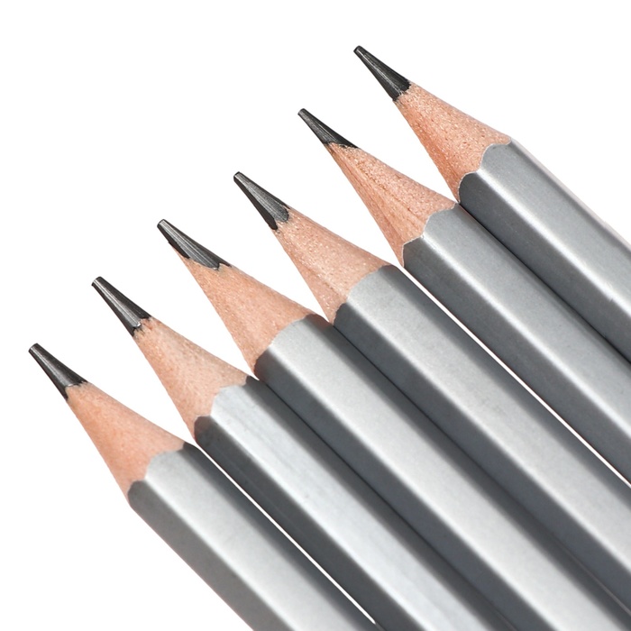 Классические шестигранные чернографитные карандаши различной степени твердости. Рекомендуются для выполнения художественных работ, графических зарисовок и чертежей. Грифель диаметром 2,2мм не царапает бумагу и не крошится. Насыщенность каждого графитового оттенка зависит от степени его жёсткости. Специальная пропитка древесины и сплошная проклейка грифеля обеспечивает высокую ударопрочность. Мягкая древесина и идеальная центровка грифеля гарантируют легкую заточку с экономным расходом карандаша