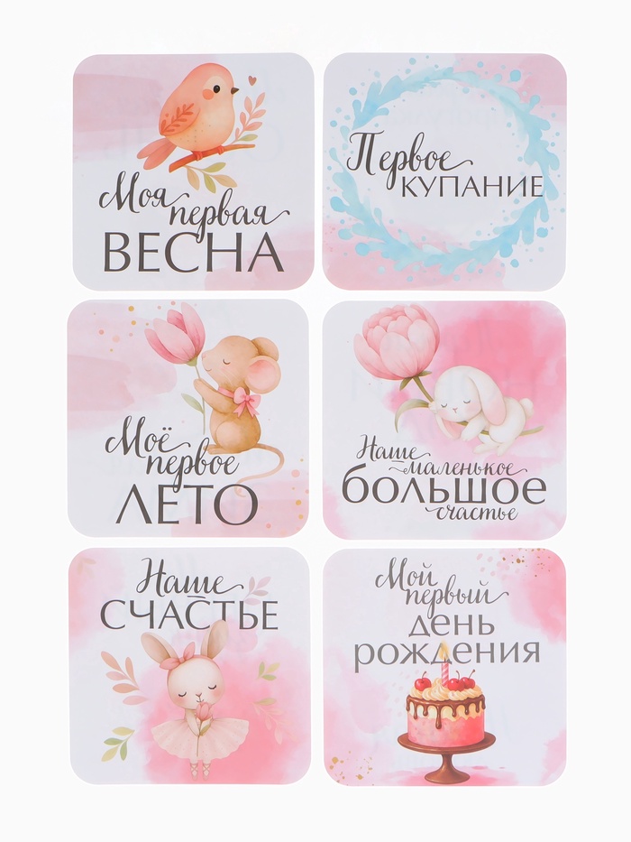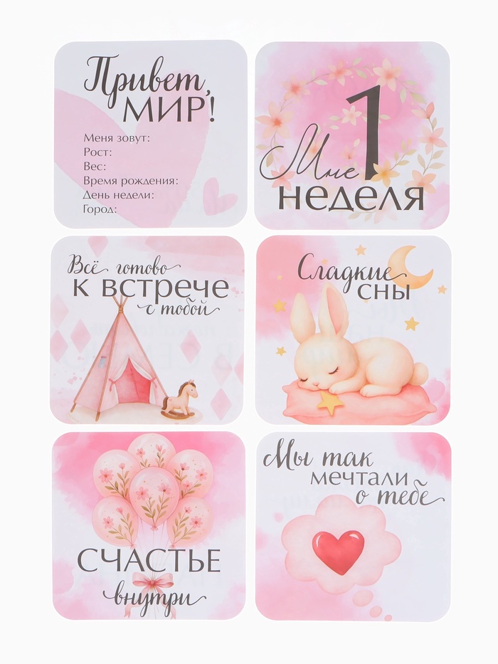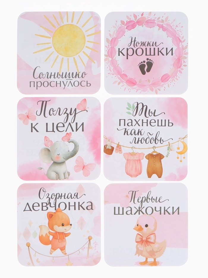Этот нежный набор фотокарточек создан для того, чтобы красиво сохранить первые мгновения жизни малышки. С помощью карточек легко оформлять домашние фотосессии, фиксировать важные события и наполнять семейный альбом тёплыми снимками. Акварельные иллюстрации в мягких розовых оттенках подчёркивают атмосферу детства и делают каждую фотографию по-настоящему трогательной.