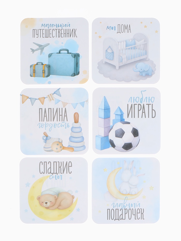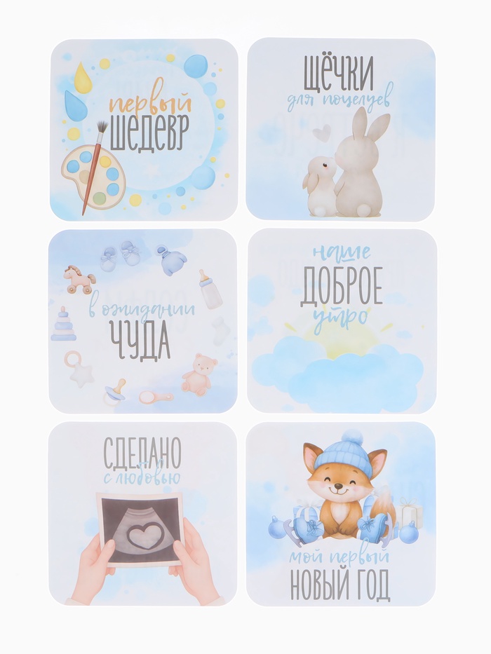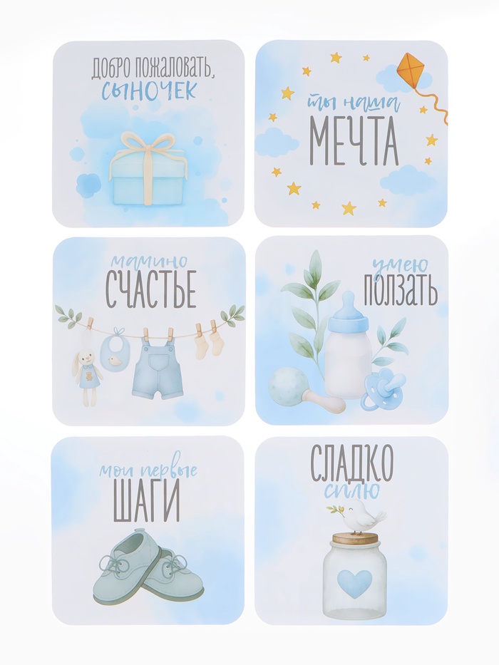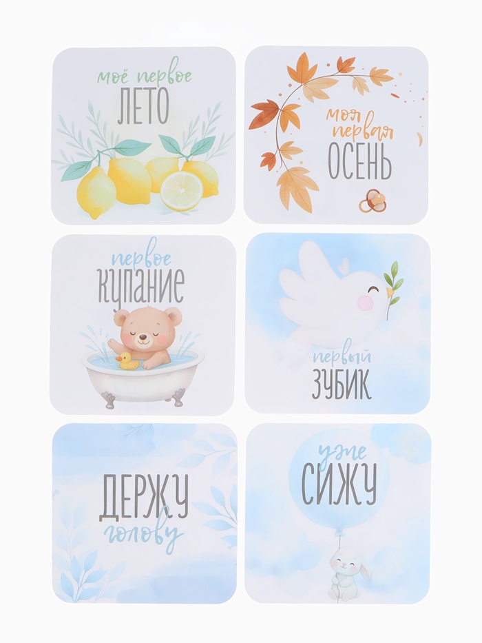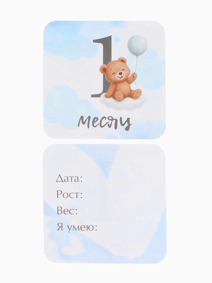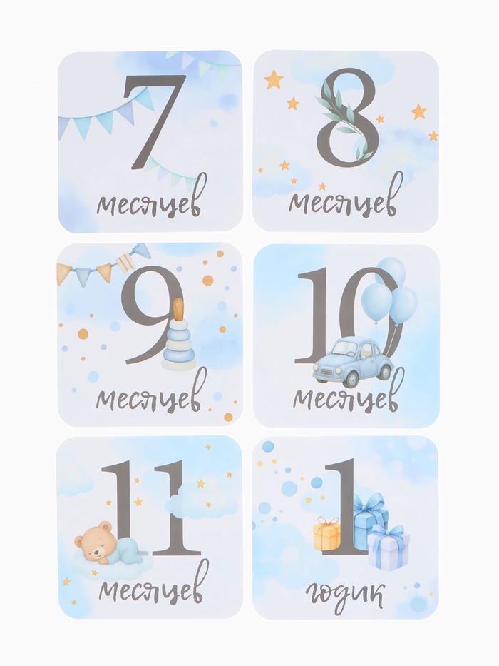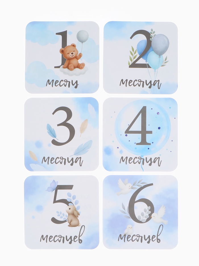 Этот набор голубых фотокарточек создан для того, чтобы красиво и трогательно запечатлеть первые месяцы жизни малыша. Карточки отлично подходят для домашних фотосессий, оформления важнейших событий и ведения семейного альбома. Спокойные голубые оттенки и аккуратные акварельные иллюстрации подчёркивают нежность детства и делают каждую фотографию атмосферной и выразительной.