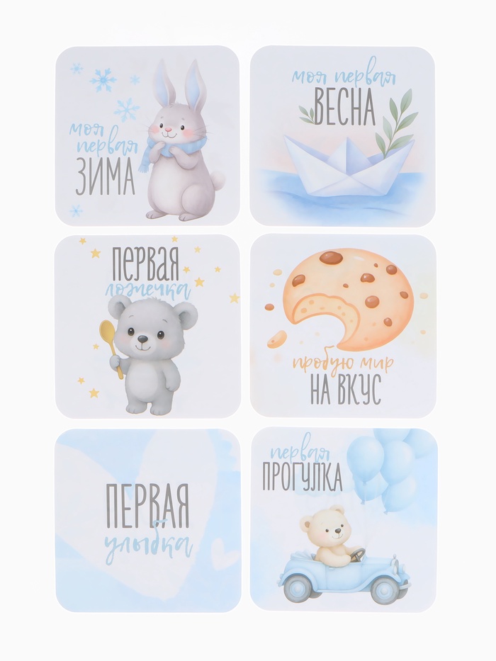 Они помогают создать стройную фотоисторию первого года ребёнка — от первых улыбок и прогулок до важных достижений. Карточки легко размещаются рядом с малышом, не бликуют на фото и органично вписываются в кадр. В альбоме они становятся важными отметками и напоминают о самых тёплых моментах.