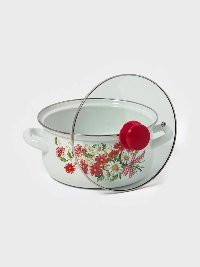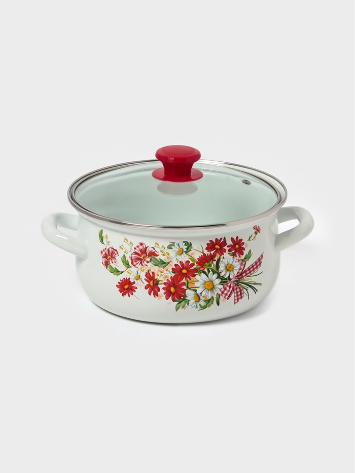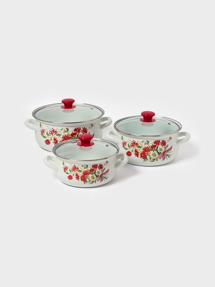 Набор эмалированных кастрюль — это базовый комплект для повседневной готовки, сочетающий проверенную надежность эмалированной стали и практичность стеклянных крышек. Белый фон с цветочным узором добавляет на кухню уют.