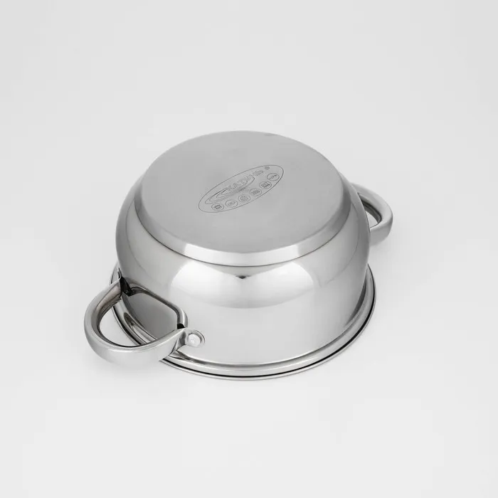 - Устойчивость к коррозии. Материал не ржавеет и не окисляется, что делает кастрюлю безопасной для приготовления пищи.