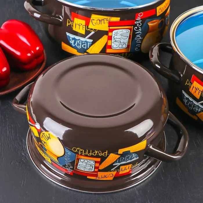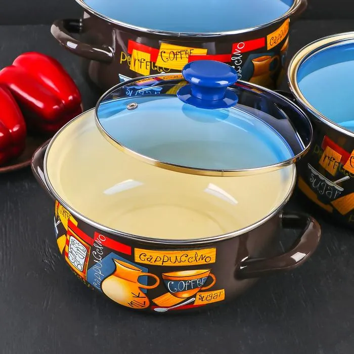 Все кастрюли выполнены из высококачественной стали и покрыты прочной эмалью, которая защищает посуду от коррозии и обеспечивает её долговечность. Эмалевое покрытие легко моется и не впитывает запахи, что делает набор идеальным выбором для приготовления различных блюд.