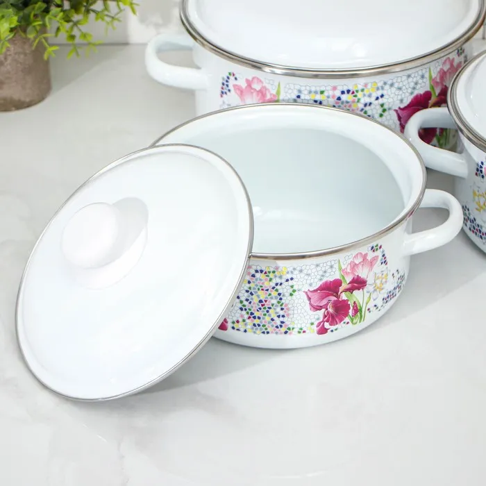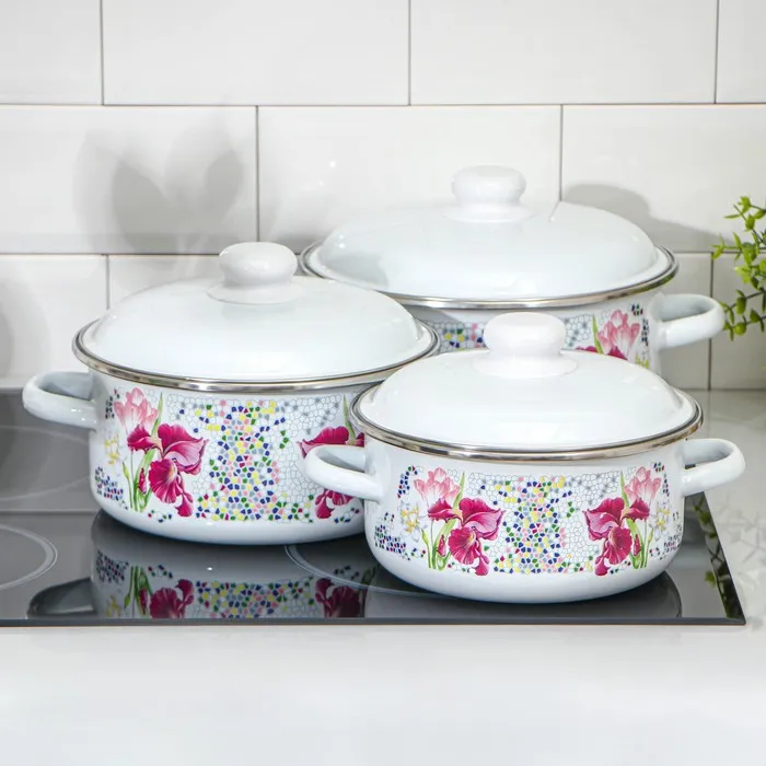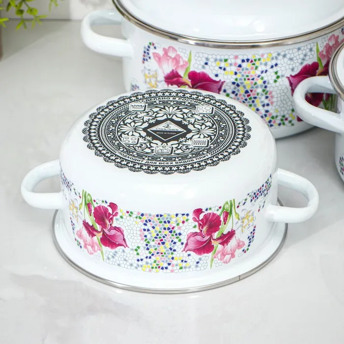 Кастрюли сделаны из качественной стали, покрытой эмалью с декоративным рисунком. Они отлично подходят для приготовления и хранения различных блюд.