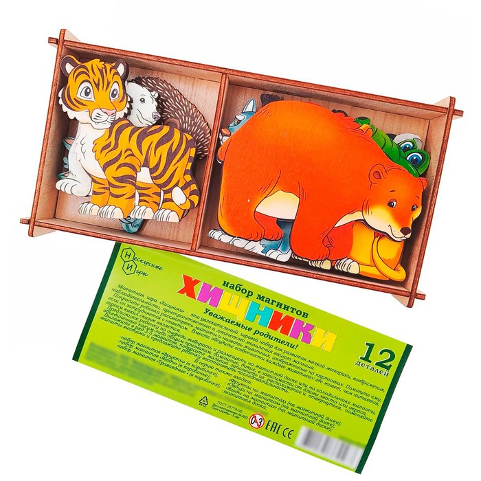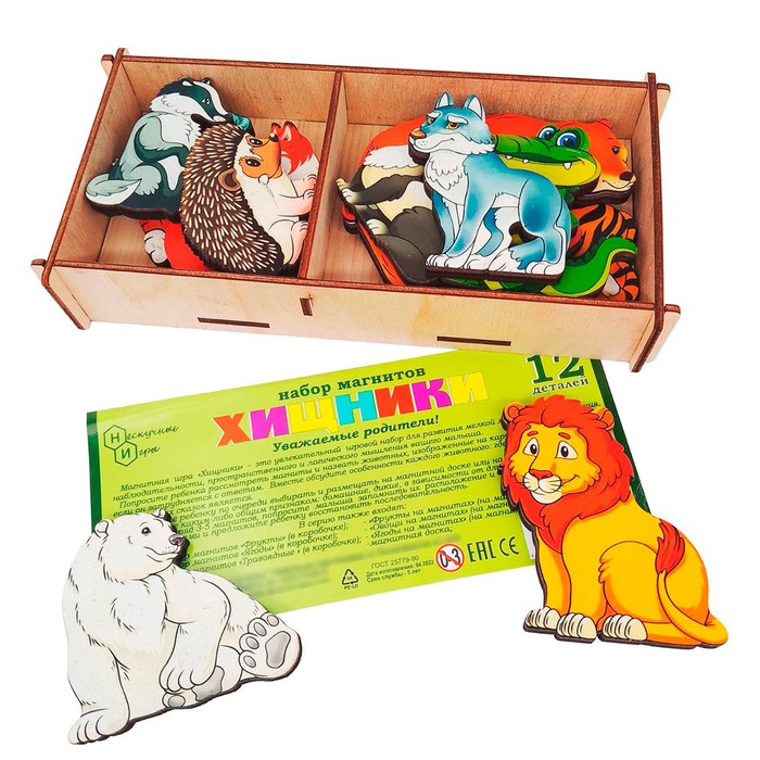 Набор «Хищники на магнитах» в коробке — это увлекательная и развивающая игрушка для детей от 3 лет. Набор включает в себя 12 деталей из натурального дерева с магнитами, изображающих различные виды хищных животных. Эта игрушка поможет вашему ребёнку развивать мелкую моторику, координацию и воображение.