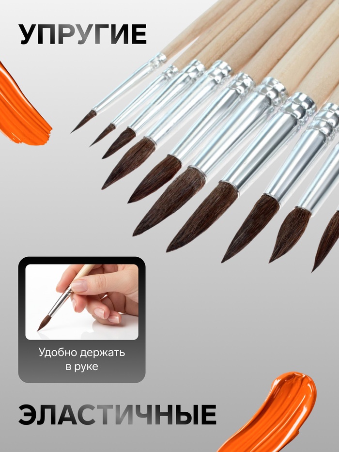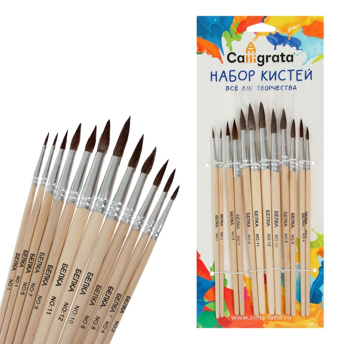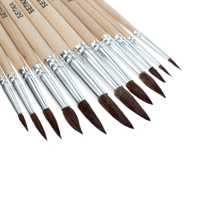 Набор кистей для рисования, белка, 12 штук: № 1, 2, 3, 4, 5, 6, 7, 8, 9, 10, 11, 12, круглые, деревянная ручка, международный размер — Характеристики