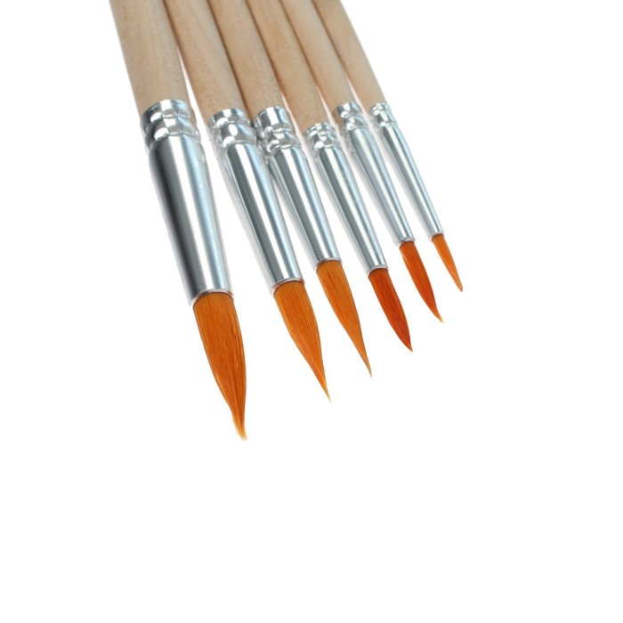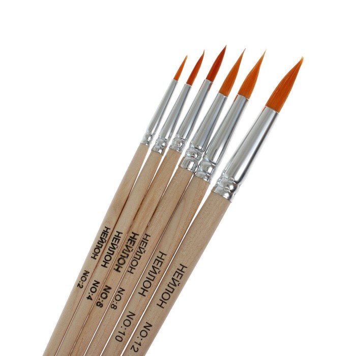 Набор кистей, нейлон, круглые, 6 шт.: №2, 4, 6, 8, 10, 12, с деревянными ручками, на блистере