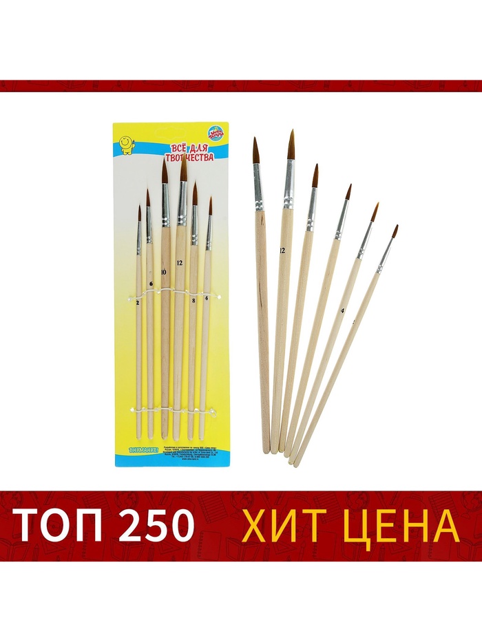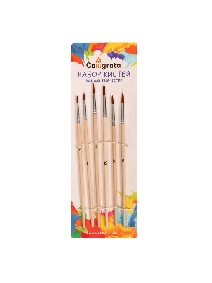 Набор кистей нейлон, круглые, средней жёсткости, 6 штук : №2, 4, 6, 8, 10, 12, с деревянными ручками, в блистере — Характеристики