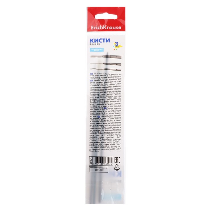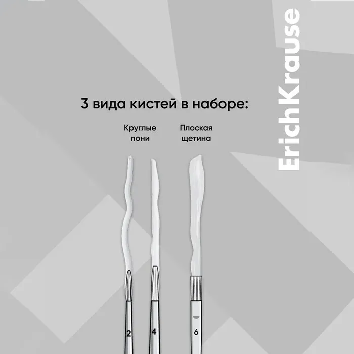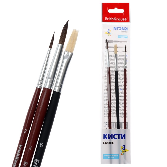 Количество в индивидуальной упаковке: 3Номер кисти: №2, №4, №6Тип волоса: пони,щетинаФорма: круглая,плоскаяНазначение кисти: акварель, акрил, гуашь, масло