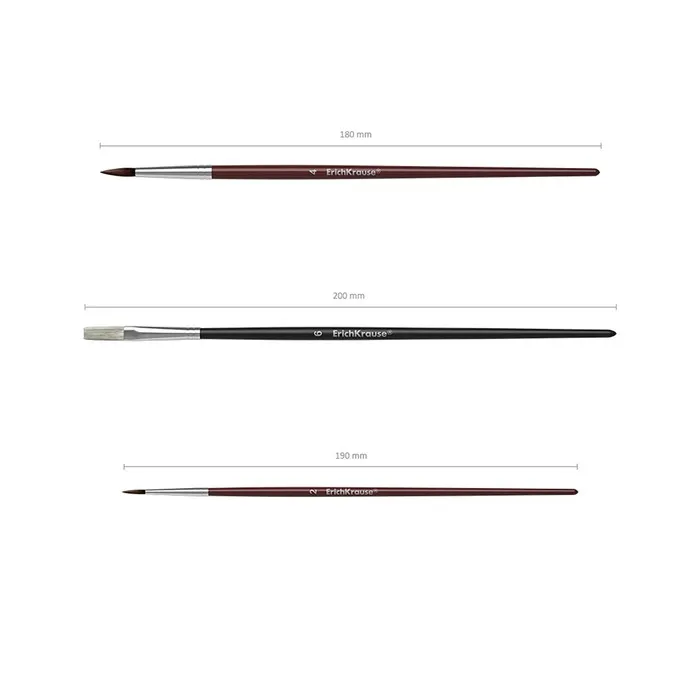 Кисти ErichKrause для рисования акварельными красками и гуашью. Хорошо впитывают и отдают краску, рабочая часть кисти покрыта гуммирующим составом, защищающим ее при хранении и транспортировке. Ручка изготовлена из натурального дерева и покрыта защитным лаком. Кисти разного размера позволяют рисовать как крупными, широкими мазками, так и прорабатывать мелкие детали рисунка. Цельнометаллическая бесшовная обойма из алюминия устойчива к коррозии. Пони круглые- 2,4; Щетина плоская- 6