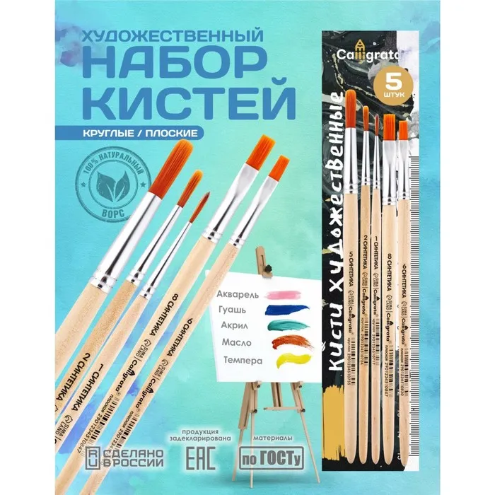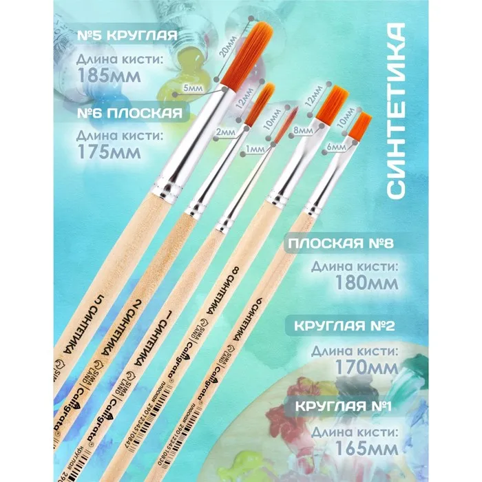 Синтетический волос имеет гладкую структуру и обладает капиллярным эффектом, что позволяет использовать такие кисти при работе с акварелью, гуашью, темперой, акрилом и маслом.