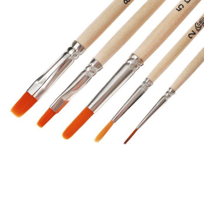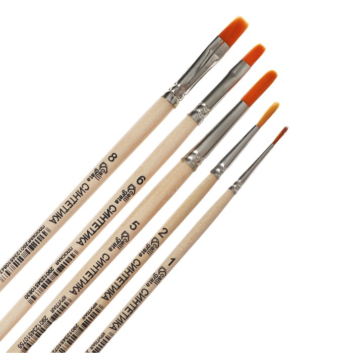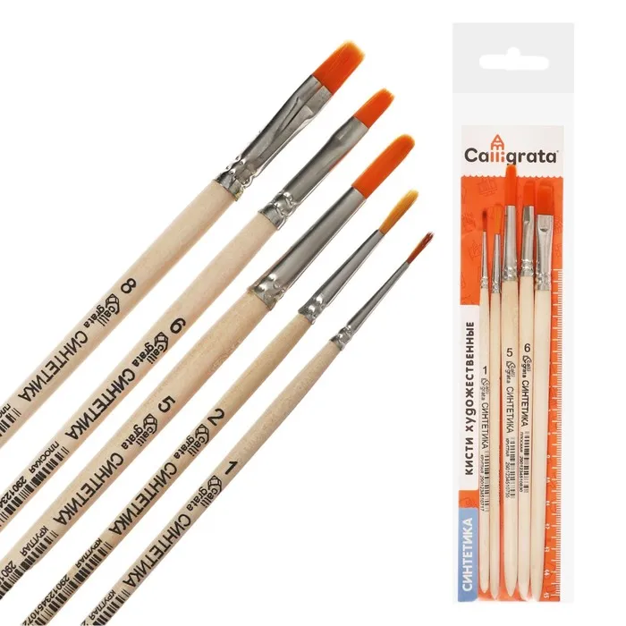 В наборе круглые кисти: №1, №2 ,№5; плоские кисти: №6, №8.