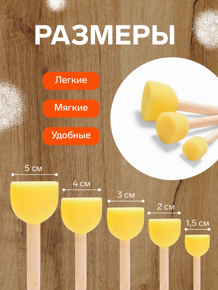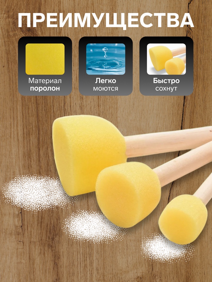 Поролоновые кисти-спонжи подойдут для нанесения краски на большие поверхности рисунка и создания интересных текстур. У кисти есть ручка, поэтому работать вы сможете аккуратно, не пачкая руки.