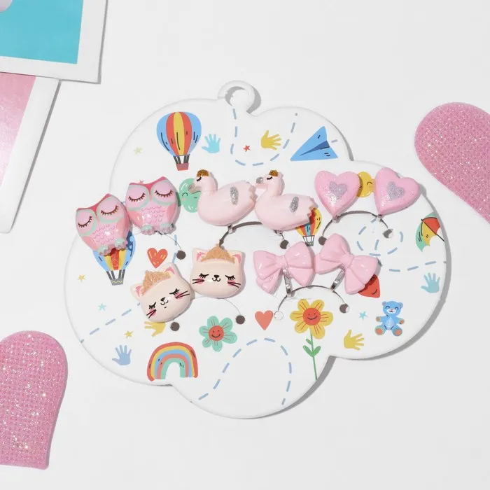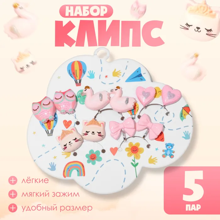 Набор детских клипс — это замечательный аксессуар для маленьких модниц, которые хотят примерить украшения, не делая проколов в ушках. В комплект обычно входят несколько пар клипс, каждая из которых оформлена с использованием ярких и милых элементов, таких как сердечки, звездочки, цветочки или фигурки животных.