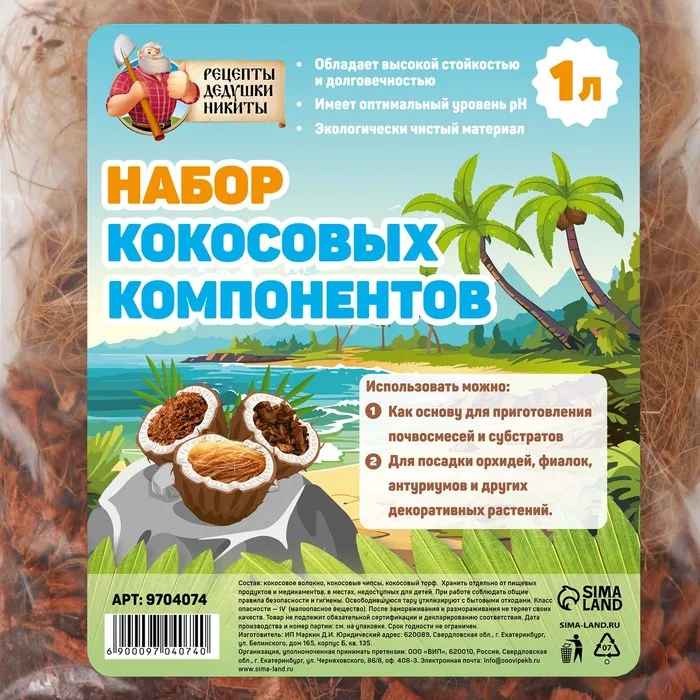 Состав: Кокосовое волокно, Кокосовые чипсы, Кокосовый торф