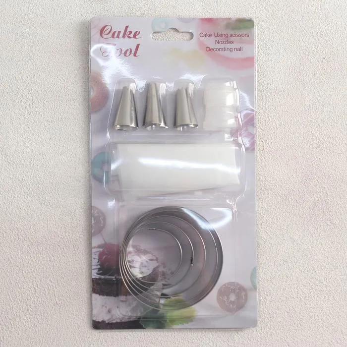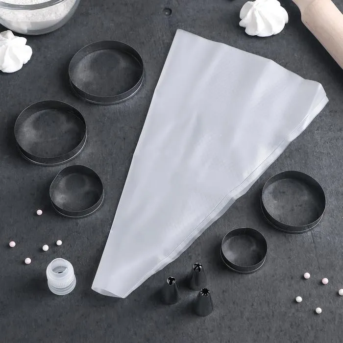 В набор входят 5 форм для выпечки в виде круга, кондитерский мешок с тремя сменными насадками и адаптер. Формы из нержавеющей стали гарантируют долговечность и равномерное распределение тепла, что помогает создавать идеально пропеченные кексы и торты. Кондитерский мешок и насадки из пластика помогут аккуратно наносить кремы, глазури и другие декоративные элементы, создавая истинные кулинарные шедевры.