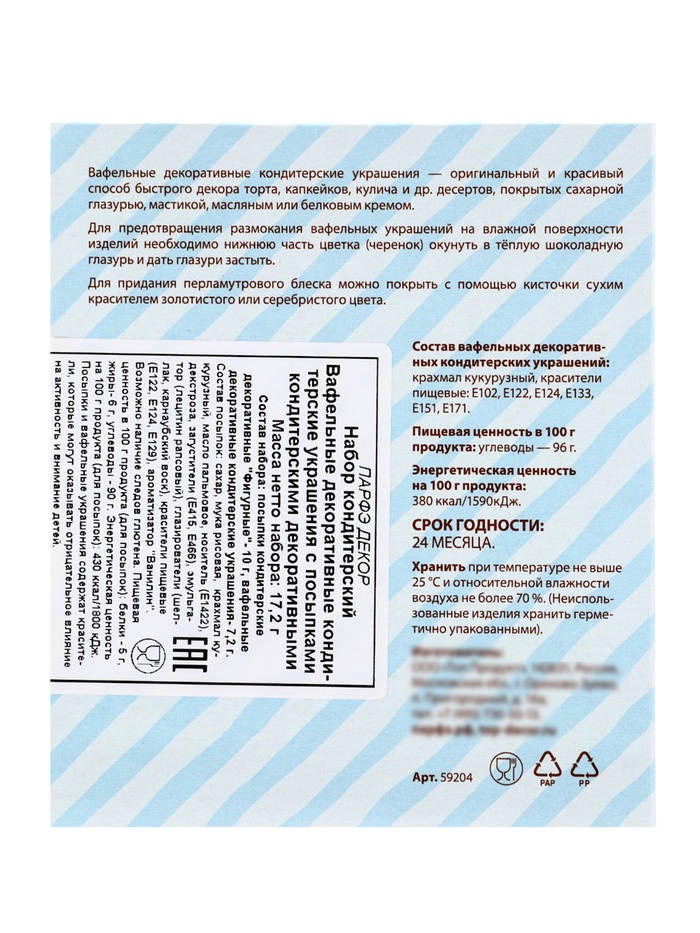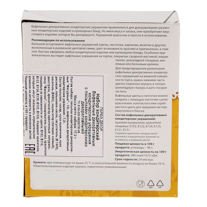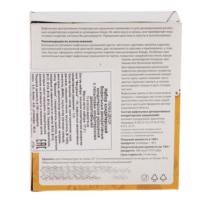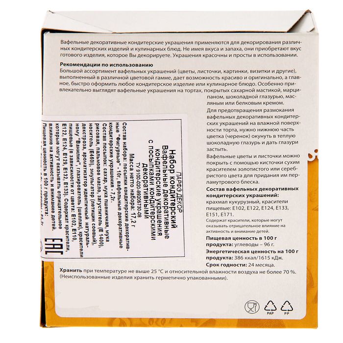 Вафельные декоративные кондитерские украшения применяются для декорирования различных кондитерских изделий и кулинарных блюд. Не изменяя вкуса и запаха, они приобретают вкус готового изделия, которое вы декорируете. Украшения красочны и просты в использовании.