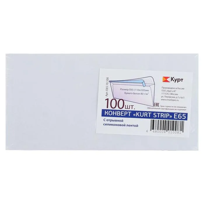 Набор конвертов E65 110 х 220 мм, без подсказа, без окна, отрывная лента, внутренняя запечатка, 80 г/м2, 100 штук — Характеристики