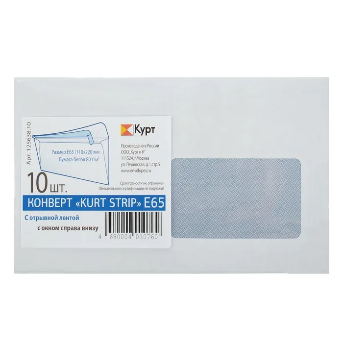 Набор конвертов Е65 110 х 220 мм, без подсказа, правое окно, отрывная лента, внутренняя запечатка, 80 г/м2, 10 штук — Характеристики